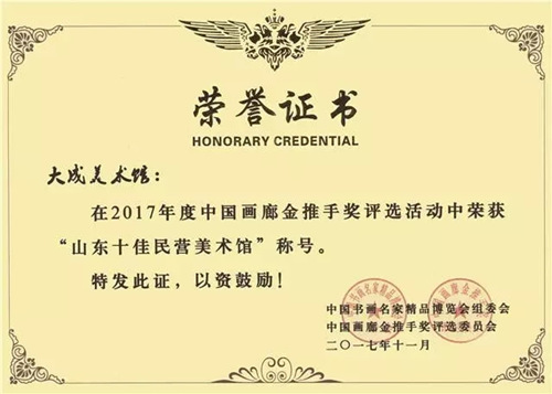 近日,在第六屆中國書畫市場健康發(fā)展論壇暨2017年度中國畫廊金推手獎頒獎盛典上,集團(tuán)旗下的大成美術(shù)館(濟(jì)南城建集團(tuán)直屬機(jī)構(gòu))應(yīng)邀參加論壇并榮獲2017年度“山東十佳民營美術(shù)館”稱號。