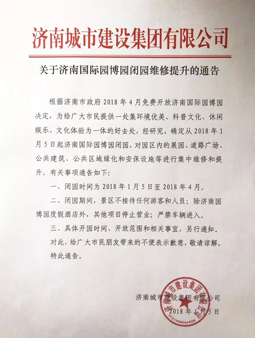 關(guān)于濟(jì)南國(guó)際園博園閉園維修提升的通告