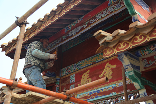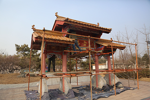 展園內(nèi)仿古彩繪維修項(xiàng)目主要對(duì)原有展園仿古建筑中木作油漆和墻面漆脫落、瓦面破損等部位進(jìn)行維修,提高建筑觀賞性。共需涂刷油漆775平方米、彩畫1013平方米、更換瓦面490平方米、涂刷乳膠漆940平方米等,目前已涂刷仿古彩繪油漆約1990平方米。