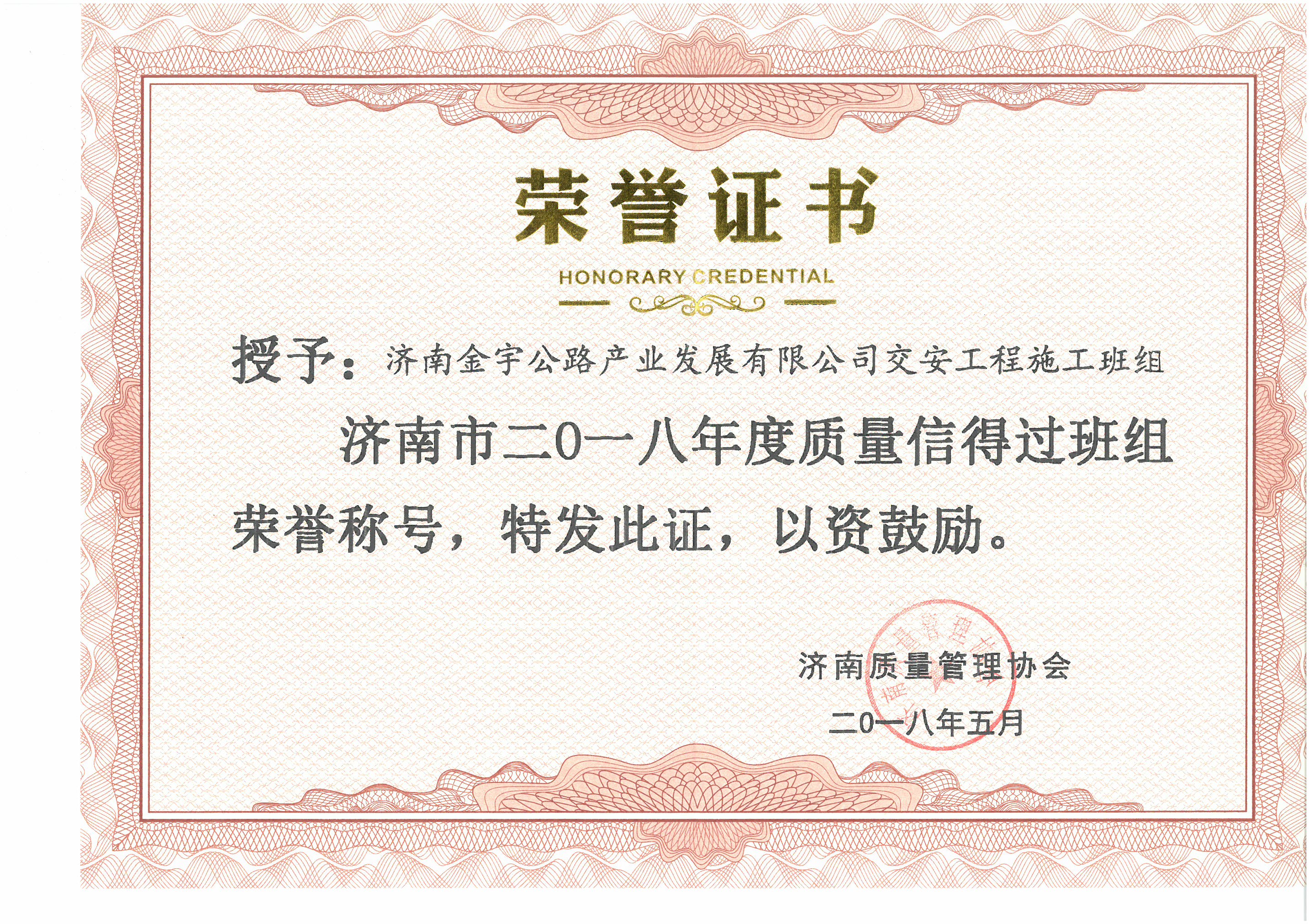 濟南金宇公路產(chǎn)業(yè)發(fā)展有限公司交安工程施工班組榮獲濟南市2018年度質(zhì)量信得過班組榮譽稱號;公司憑借《提高防眩網(wǎng)安裝一次驗收合格率》、《提高標(biāo)志版面安裝平整度》兩項課題榮獲“濟南市2018年度質(zhì)量管理成果一等獎”;《提高公路聲屏障線性順直度合格率》課題榮獲“濟南市2018年度質(zhì)量管理成果二等獎”;《降低熱熔標(biāo)線逆反射系數(shù)衰減率》課題榮獲“濟南市2018年度質(zhì)量管理成果三等獎”;授予李玉寶、李景軍、劉莉三名同志2018年濟南市優(yōu)秀質(zhì)量管理工作者稱號。