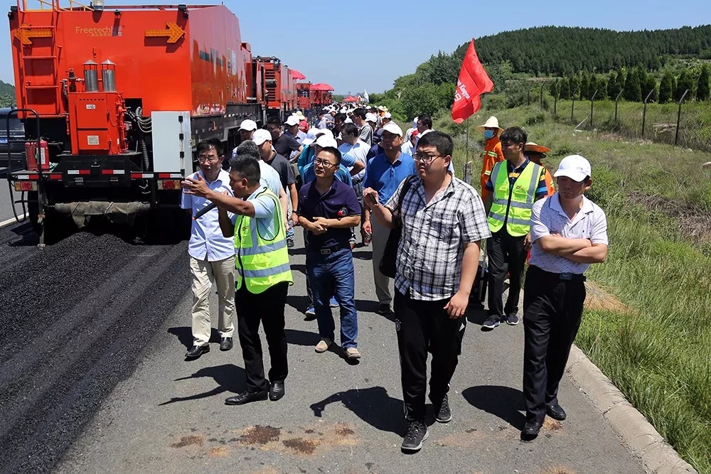 6月28日,由濟南金曰公路工程有限公司組織承辦的濟南公路學會就地熱再生技術交流及現(xiàn)場觀摩會在平陰舉行。山東公路學會副秘書長劉成海、濟南市公路管理局副局長任順祥、濟南城市建設集團副總經理安玉坤等領導同志,及省內20多家公路學會、設計院相關負責人參加活動。就施工工藝進行介紹交流后,與會人員到金曰承建的濟菏高速公路維修工程WX-1標段,現(xiàn)場觀摩了就地熱再生技術的施工情況。