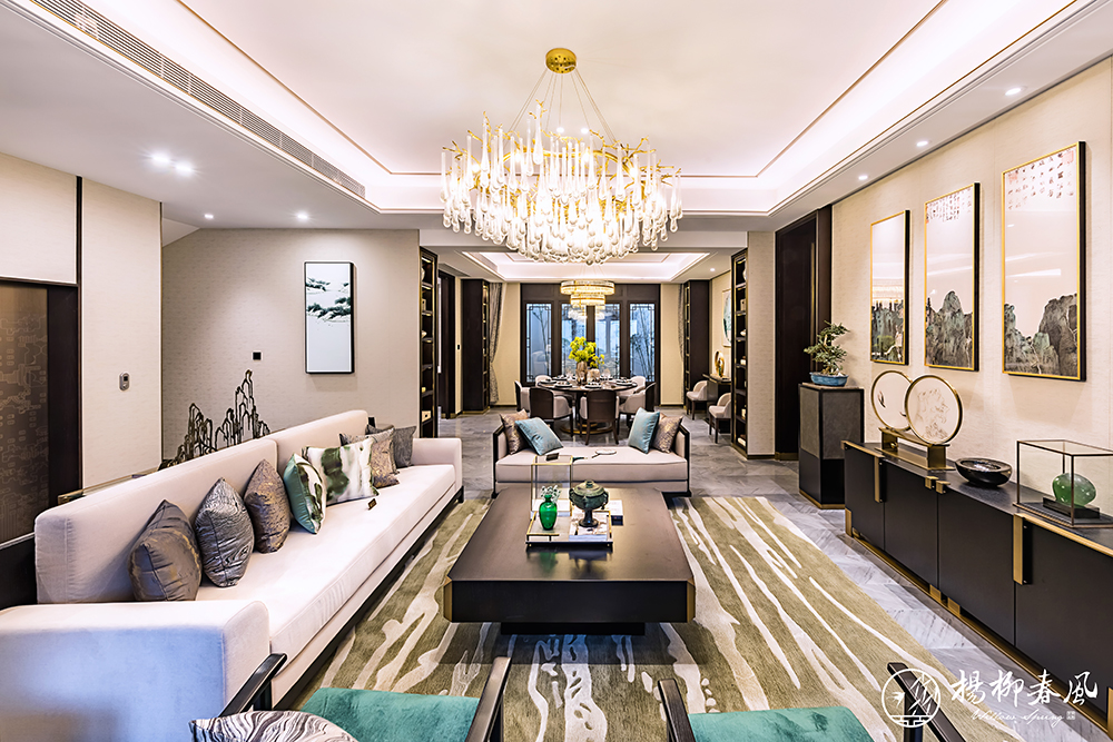 另一套大戶型樣板房采用新中式風(fēng)格,以儒家思想為依托,通過大理石、金屬銅、木材的有機(jī)結(jié)合,體現(xiàn)主人的穩(wěn)重、尊貴和優(yōu)雅。約110㎡的大面積庭院,演繹著四季不落幕的錦繡風(fēng)光;挑高約5.7米的地下空間,讓格調(diào)生活隨心定制。整套樣板房抒寫著文雅靈動(dòng)的東方氣韻,展現(xiàn)了“中正和雅”的國風(fēng)意境。