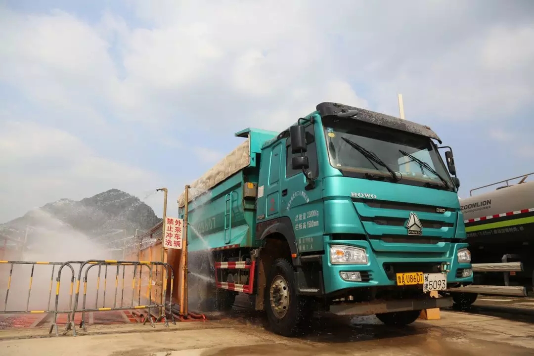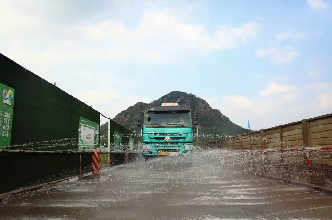 該項目除按照相關(guān)要求安裝自動汽車沖洗平臺、便道兩側(cè)設(shè)置環(huán)場噴淋、出入口安裝24小時揚塵在線監(jiān)測和視頻監(jiān)控設(shè)備外,還組織了各參建單位技術(shù)力量,創(chuàng)新開發(fā)了不停車沖洗設(shè)施作為輔助標準化洗車平臺,以加強沖洗效果。出入口設(shè)置凈車檢查點,對沖洗不徹底的部位,采用手持高壓水槍進行徹底清洗。目前項目的各出入口均已配置2臺自動汽車沖洗平臺,2臺高壓水槍和不停車沖洗設(shè)施。通過以上措施,實現(xiàn)施工范圍內(nèi)揚塵情況24小時零死角監(jiān)控,確保外運車輛不帶泥上路。