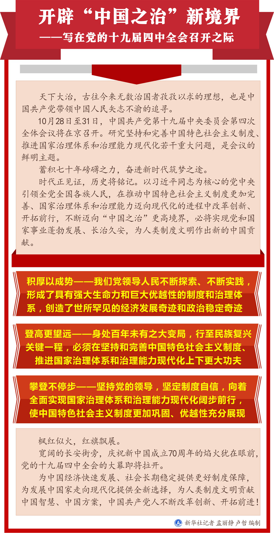 10月28日至31日,中國(guó)共產(chǎn)黨第十九屆中央委員會(huì)第四次全體會(huì)議將在京召開(kāi)。研究堅(jiān)持和完善中國(guó)特色社會(huì)主義制度、推進(jìn)國(guó)家治理體系和治理能力現(xiàn)代化若干重大問(wèn)題,是會(huì)議的鮮明主題。