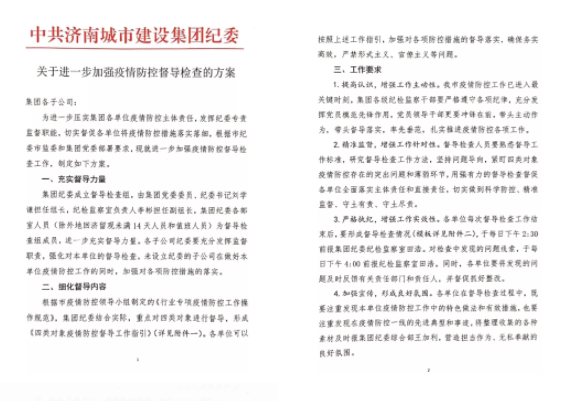 疫情就是命令,防控就是責(zé)任。濟南城市建設(shè)集團把疫情防控作為當(dāng)前最重要的政治任務(wù)來抓,按照中央、省、市委關(guān)于做好新型冠狀病毒肺炎疫情防控的部署和要求,快速響應(yīng),迅速部署,采取有力措施,注重黨委、紀(jì)委兩個責(zé)任的協(xié)同配合,深化一線督導(dǎo)檢查,以最堅決的態(tài)度、最嚴(yán)格的執(zhí)行、最果斷的行動,全力以赴推動疫情防控責(zé)任落實。