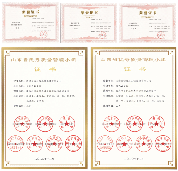 質(zhì)量是企業(yè)的生命,工程質(zhì)量是工程建設(shè)的核心。金諾公司積極組織科技工作者參加全面質(zhì)量管理培訓(xùn)、鼓勵(lì)科技工作者依托監(jiān)理服務(wù)項(xiàng)目開展全面質(zhì)量管理活動(dòng)。2020年度金諾公司組建了10個(gè)QC小組,取得QC成果11篇。其中4個(gè)QC小組(成果)獲地市級(jí)獎(jiǎng)項(xiàng),4個(gè)QC小組(成果)獲省部級(jí)獎(jiǎng)項(xiàng)。