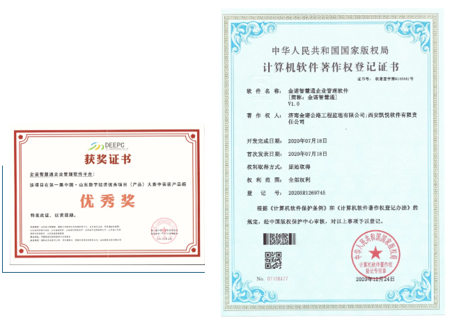 2020年,金諾公司與西安凱悅軟件有限責(zé)任公司合作,研發(fā)了“金諾智慧通”企業(yè)管理軟件,于2020年12月取得中國版權(quán)保護(hù)中心頒發(fā)的軟件著作權(quán)登記證書。“金諾智慧通”參加了第一屆中國(山東)數(shù)字經(jīng)濟(jì)優(yōu)秀項(xiàng)目(產(chǎn)品)大賽,并獲得產(chǎn)品組“優(yōu)秀獎(jiǎng)”。同時(shí),2020年下半年推動(dòng)的針對(duì)公路工程建設(shè)開發(fā)的“路面三維剖面破損(病害)自動(dòng)檢測(cè)系統(tǒng)”、“橋梁在線監(jiān)測(cè)系統(tǒng)”等8個(gè)軟件已申報(bào)軟件著作權(quán)登記,軟件著作權(quán)登記證書已于2021年3月份下發(fā)。