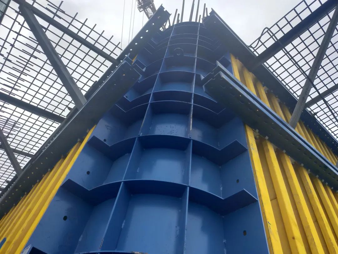 新建黃河大橋采用新橋與老橋并建的形式,在老橋下游33.5米處復(fù)線姊妹橋,兩個(gè)主塔設(shè)計(jì)高度168米,形狀為寶瓶型。“寶瓶”瓶腹處呈圓弧狀,主塔最外沿幾乎與老橋“肩并肩”,傳統(tǒng)翻模工藝需要大量的鋼管搭建支架予以支撐,空間狹窄,施工人員就更難對(duì)模板進(jìn)行有效加固。