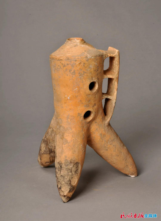 除了玉器,這里還展出了齊家文化最具代表性的器物——陶器。其中一件叫三足盉,是齊家陶器的代表性器物。這件展品問世后,因結(jié)構(gòu)巧妙、制作精良、年代久遠(yuǎn)且保存非常完整,引起了國際上的關(guān)注,獲得世界各國專家學(xué)者的一致好評。