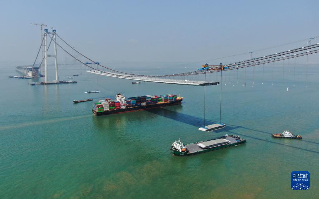 集裝箱貨輪通過正在吊裝鋼箱梁的深中通道伶仃洋大橋(2023年2月22日攝,無(wú)人機(jī)照片)。新華社記者 鄧華 攝