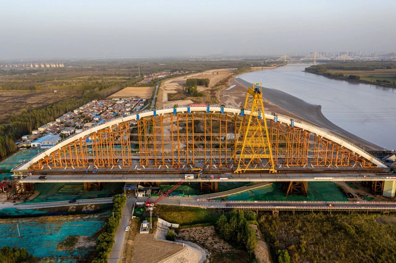 在420米跨拱肋提升中,施工單位中交二公局提出“梁拱分離頂推、先梁后拱、梁上架拱工藝”,創(chuàng)新研發(fā)“無合龍段整體提升合龍工藝”進(jìn)行主跨拱肋架設(shè),整體提升重量6800T,提升段跨徑300m,提升高度25.5m,為橋梁領(lǐng)域首次研發(fā)并成功應(yīng)用,被譽(yù)為“黃河第一拱、世界第一吊”。
