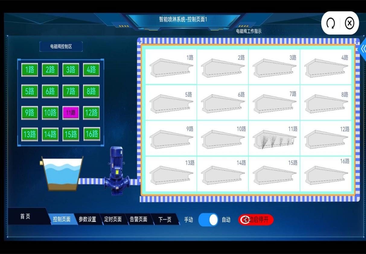 該系統(tǒng)在梁場建設(shè)時提前在臺座中預埋噴淋管道,管道與自動供儲水后臺相連通。當T梁模板拆除后,可通過手機APP控制噴淋系統(tǒng)對T梁的腹板和翼板進行全面均勻噴灑,確保T梁養(yǎng)護無死角,同時通過手機應(yīng)用控制養(yǎng)護操作,隨時隨地一鍵啟動或關(guān)閉,必要時選擇自動化模式,實現(xiàn)T梁24小時不間斷養(yǎng)護。