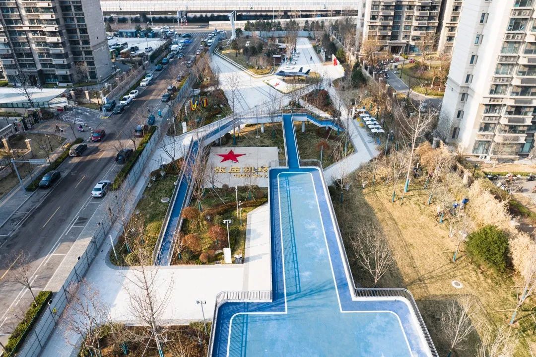 公園北區(qū)主要通過對飛機造型提取折線元素,結(jié)合不同的主題節(jié)點來營造多維度的場景空間,參照原有機場航站樓造型設(shè)計的造型觀景廊橋,包括保留和利用張莊機場原有的水泥跑道地面進行二次設(shè)計,結(jié)合廊架、座椅、智能健身器械等設(shè)施,將張莊機場歷史文化融入景觀設(shè)計,市民不僅能欣賞公園景色,還能在休閑娛樂中接受文化熏陶,感受軍民團結(jié)一心的濃厚氛圍。