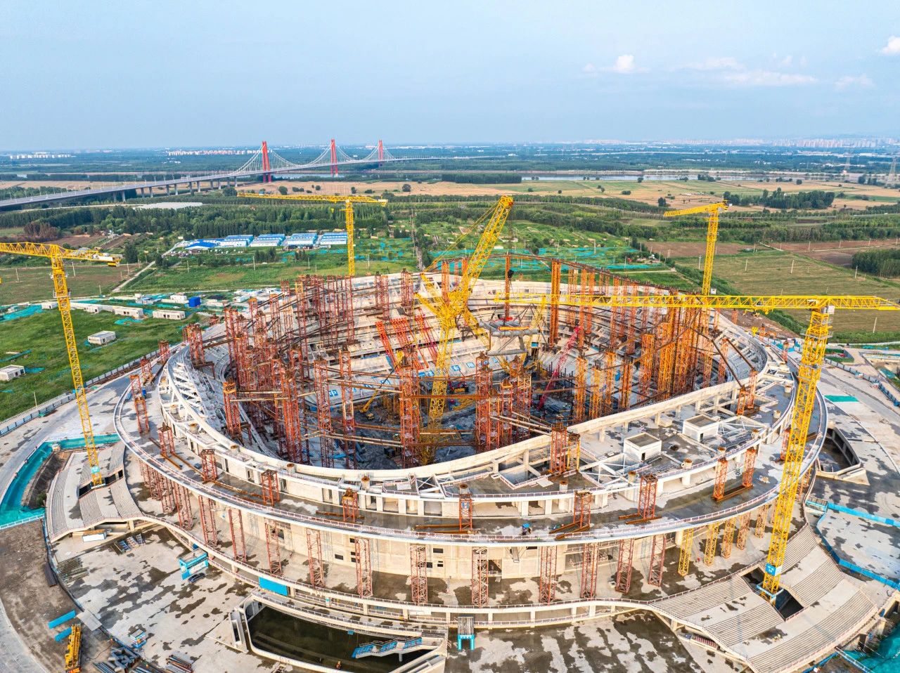 7月4日,山東省首個6萬座專業(yè)足球場——濟(jì)南黃河體育中心專業(yè)足球場項(xiàng)目屋蓋鋼結(jié)構(gòu)第一榀桁架吊裝正式起吊,標(biāo)志著這座世界首個具有最大懸挑鋼屋蓋、最大單層PTFE覆膜的鋼-索-膜混合空間結(jié)構(gòu)建筑,從設(shè)計(jì)理論走向?qū)嵺`,全面進(jìn)入屋蓋鋼結(jié)構(gòu)施工階段。