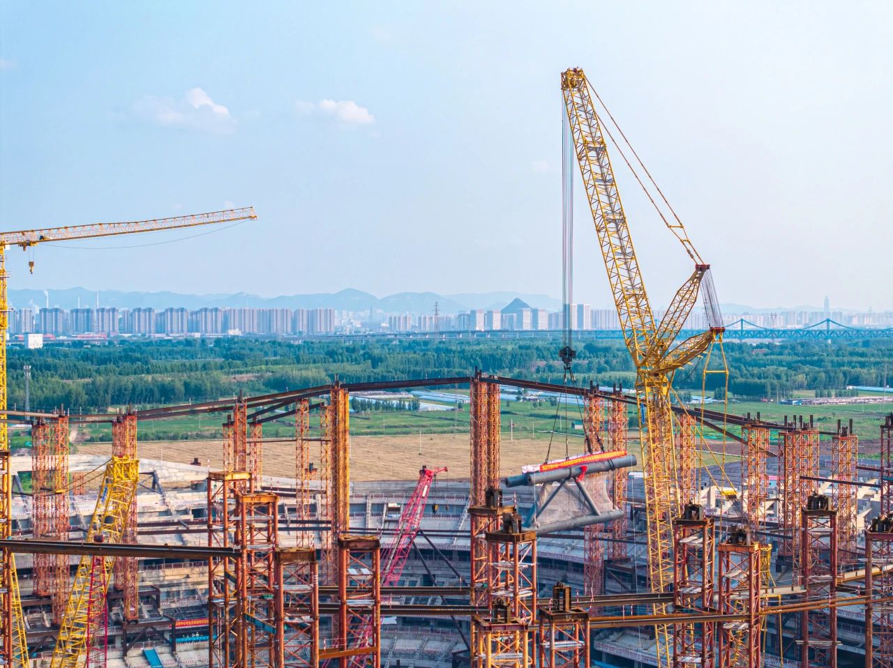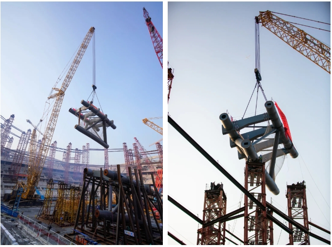 本次實(shí)施的首次吊裝段,位于內(nèi)環(huán)桁架,單元吊重達(dá)168噸,起吊縱深高達(dá)60余米。項(xiàng)目位于濟(jì)南新舊動能轉(zhuǎn)換起步區(qū),建筑面積19.73萬平方米,建筑高度為60米,是山東省首個6萬座專業(yè)足球場,可承辦國際、國內(nèi)重大體育賽事。同時也是國內(nèi)體育場館懸挑長度最大的工程,最大懸挑長度達(dá)到了45米,屋蓋鋼結(jié)構(gòu)由星形拱桁架、內(nèi)環(huán)桁架、外環(huán)桁架、單層網(wǎng)格及挑檐組成,總鋼量約3.1萬噸,靠36根排架柱支撐,形成巨型無柱大懸挑空間,在整體結(jié)構(gòu)中起到了承上啟下作用,下方排架柱與混凝土結(jié)構(gòu)相連,上方支撐索結(jié)構(gòu)、膜結(jié)構(gòu)。項(xiàng)目預(yù)計(jì)在2026年底竣工驗(yàn)收完成。