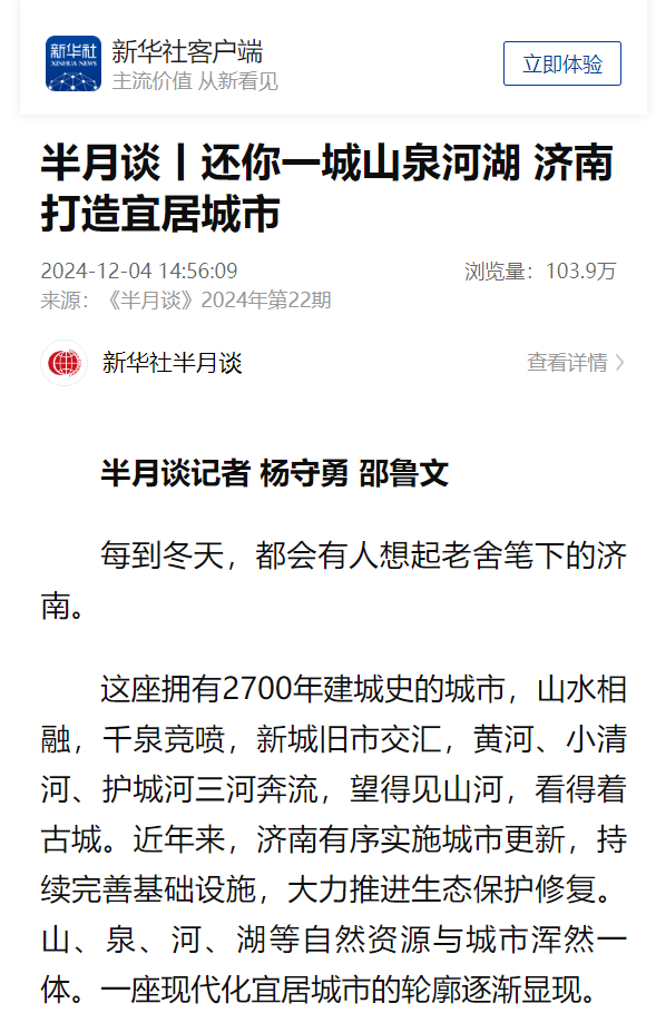 這座擁有2700年建城史的城市,山水相融,千泉競噴,新城舊市交匯,黃河、小清河、護(hù)城河三河奔流,望得見山河,看得著古城。近年來,濟(jì)南有序?qū)嵤┏鞘懈拢掷m(xù)完善基礎(chǔ)設(shè)施,大力推進(jìn)生態(tài)保護(hù)修復(fù)。山、泉、河、湖等自然資源與城市渾然一體。一座現(xiàn)代化宜居城市的輪廓逐漸顯現(xiàn)。